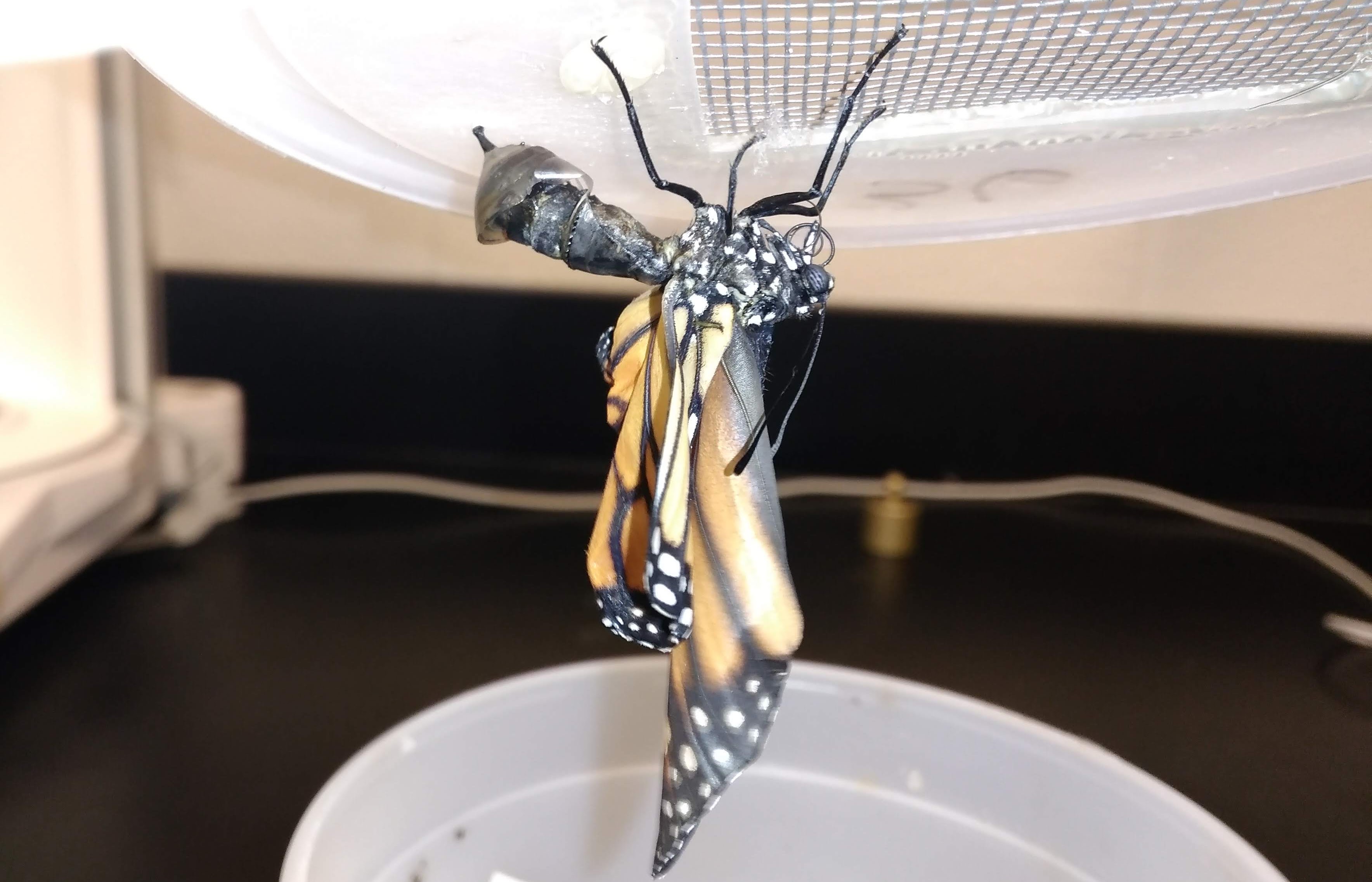 Figure 3: Monarch with number and tab on wings. Monarchs were observed from outside the cage and identified on the wing.